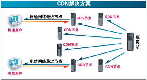 CDN网站加速服务 在电信和网通分别放一个缓存服务器. 用户实际访问缓存服务器,缓存服务器 再原网站服务器读取内容.并将已经读取的内容缓存到本地